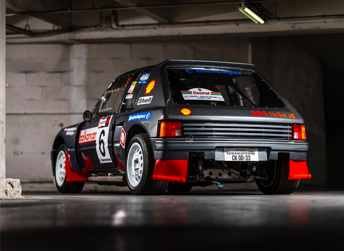 “Cette unique Evo 1 « aftermarket » est engagée en compétition dès 1985 et participe à six rallyes du Championnat d'Europe avec le pilote bulgare Ilia Tchoubrikov à son volant. Suite à l'interdiction des voitures de Gr. B en rallye à la fin de la saison 1986, la voiture est engagée dès 1987 dans le championnat d'Europe de Course de Côte (catégorie Gr. B). Elle termine 2e en 1988 et 1989 et remporte le championnat en 1990. En 1991, notre 205 T16 est vendue à un collectionneur suisse qui la revendra à l'actuel propriétaire en 2018. Elle a depuis bénéficié d'une restauration complète et est aujourd'hui prête à reprendre du service. Elle est accompagnée d'un dossier comprenant les copies des contrats orignaux attestant de la modification de la voiture, de différentes factures, de son barré rouge et divers autres documents d'époque”.