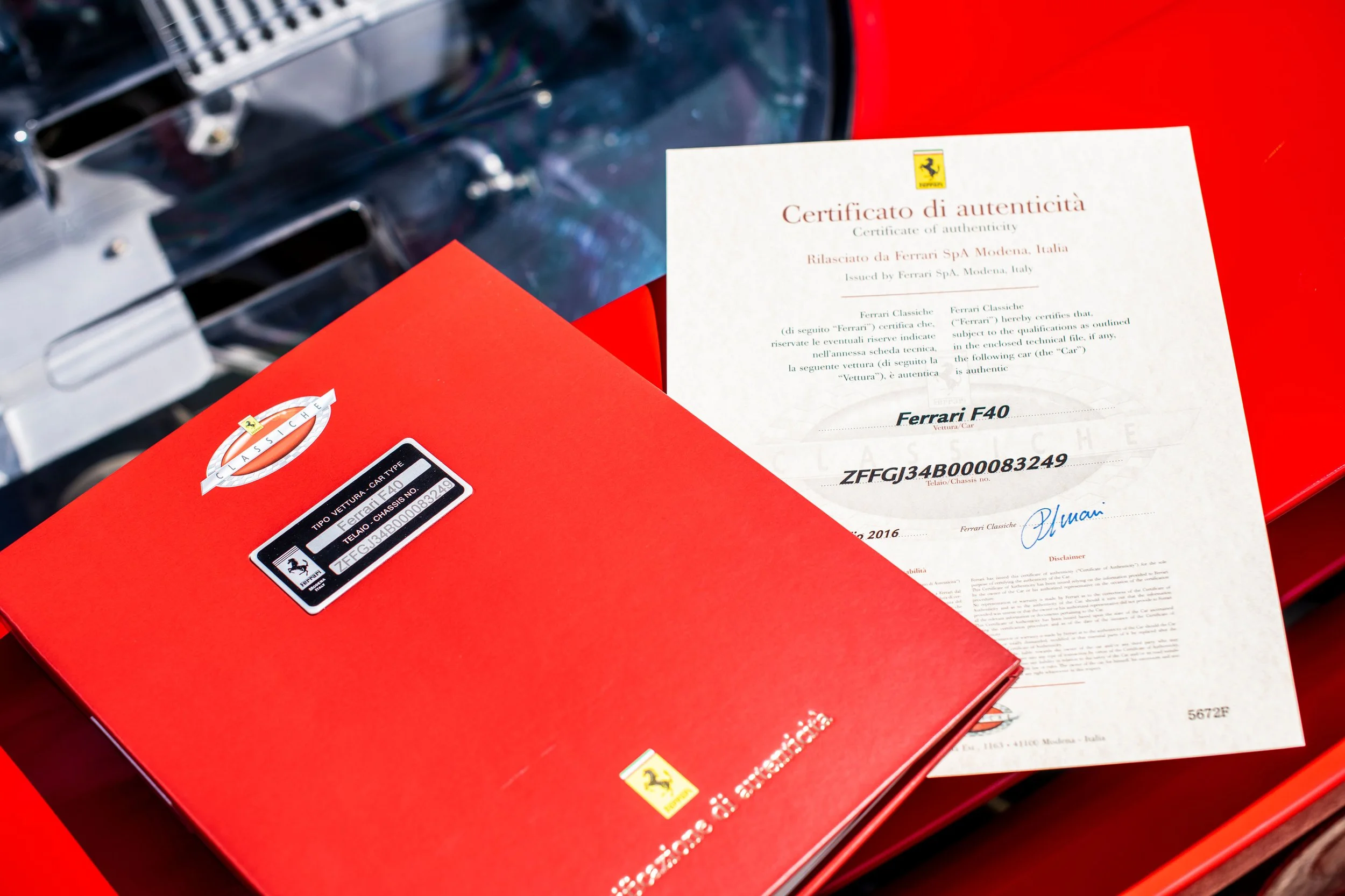 Actuellement résidante en France cette Ferrari F40 châssis ZFFGJ34B000083249 a subit un gros entretien en Mars 2019 chez Ferrari Lyon au cours duquel les réservoirs d’essence ont été changés. Ils sont valides jusqu’en 2028. Proposée avec moins de 2900 miles au compteur, cette F40 est proposée aux enchères avec un jeu de pneus neufs, sa trousse à outils, son spoiler avant et la bagagerie Schedoni d’origine. La documentation d’origine accompagne bien évidemment les derniers éléments cités.