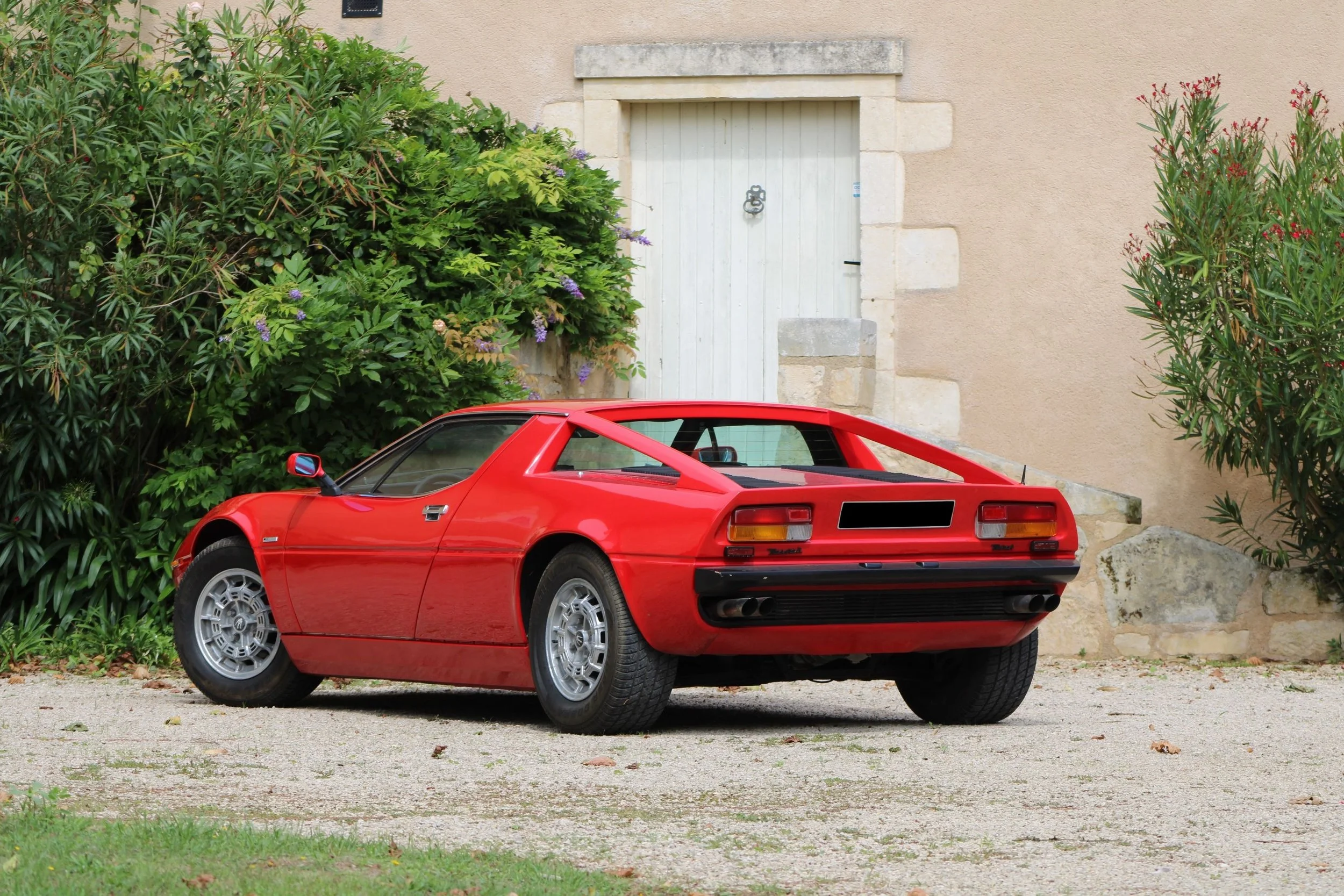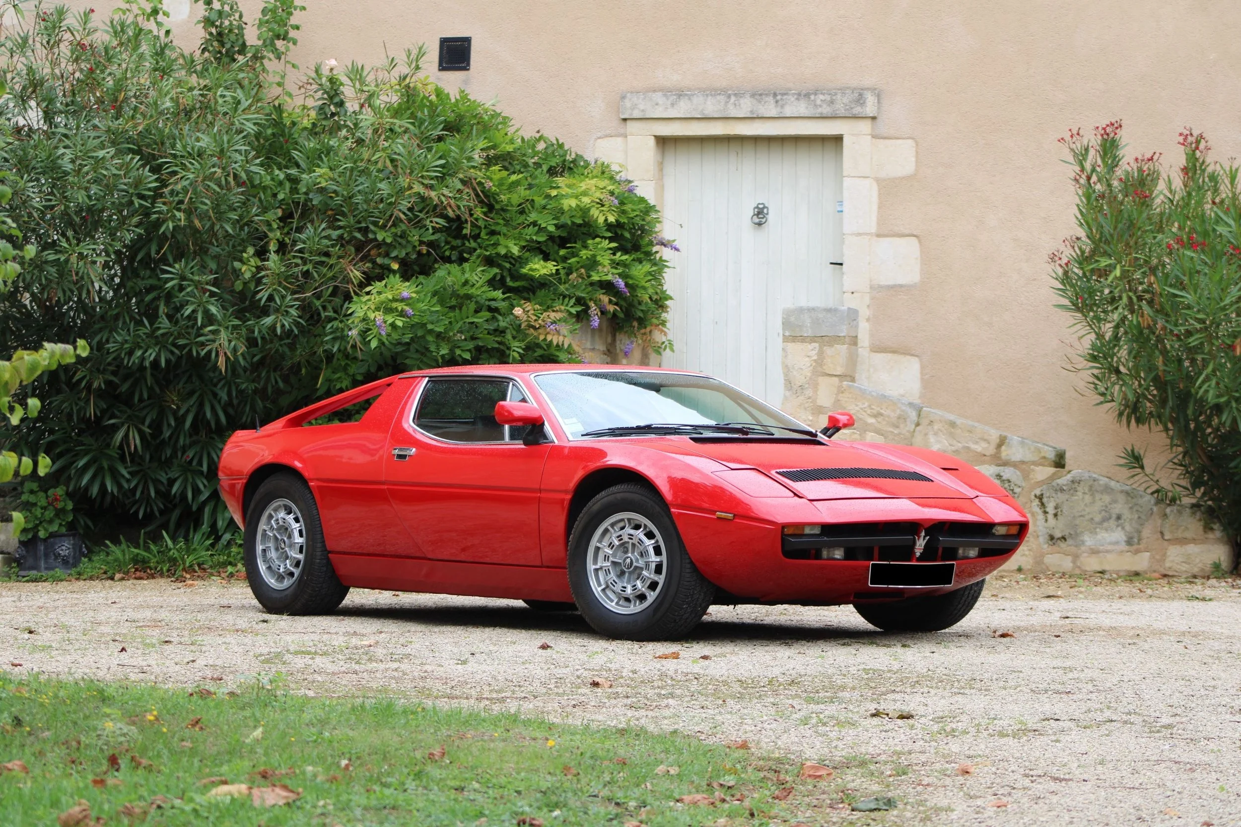 Récemment remise en route en 2025, cette Maserati est sortie d’usine le 3 février 1973, de couleur cuivre avec intérieur en cuir tan. Elle a été repeinte depuis.