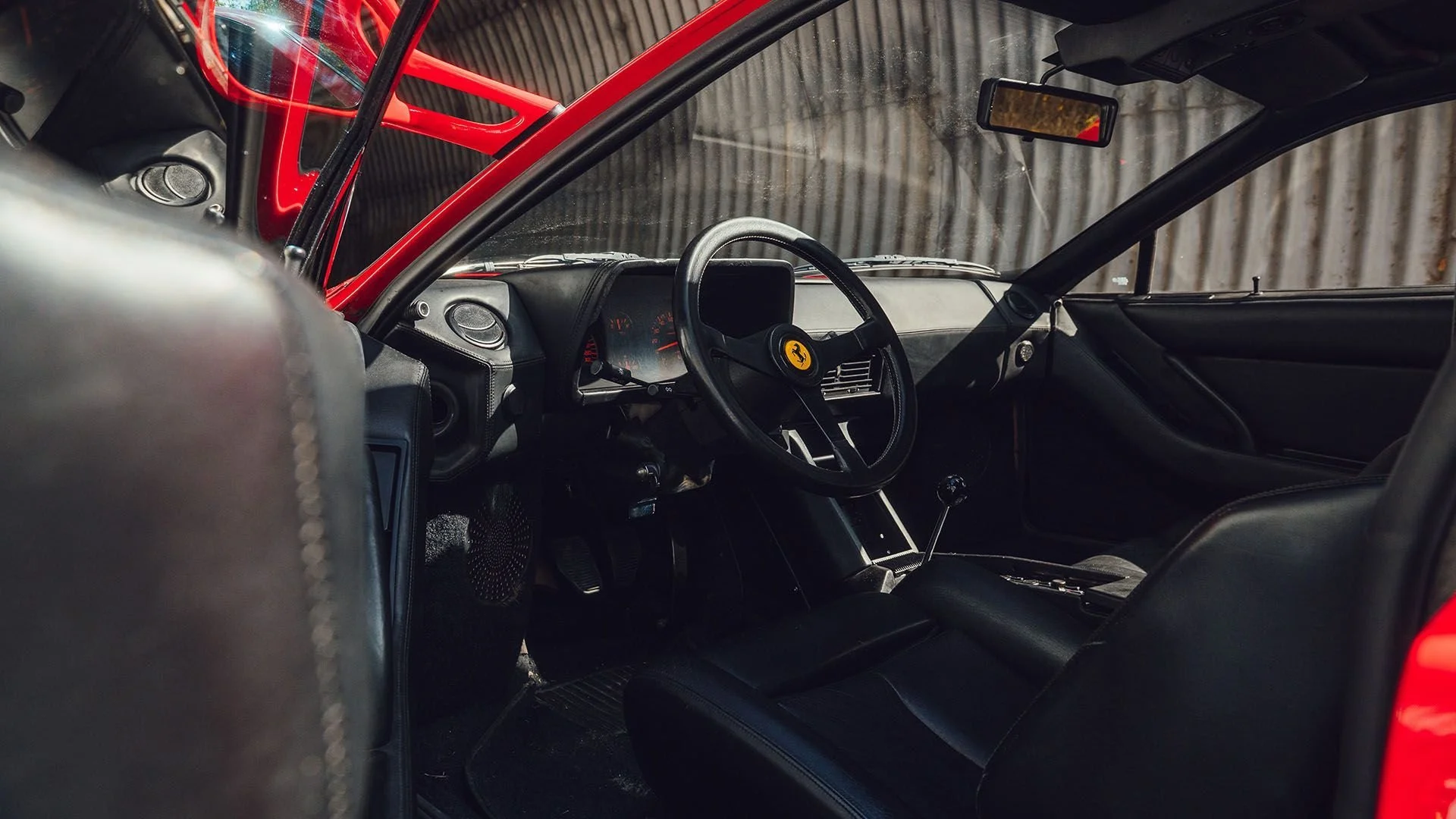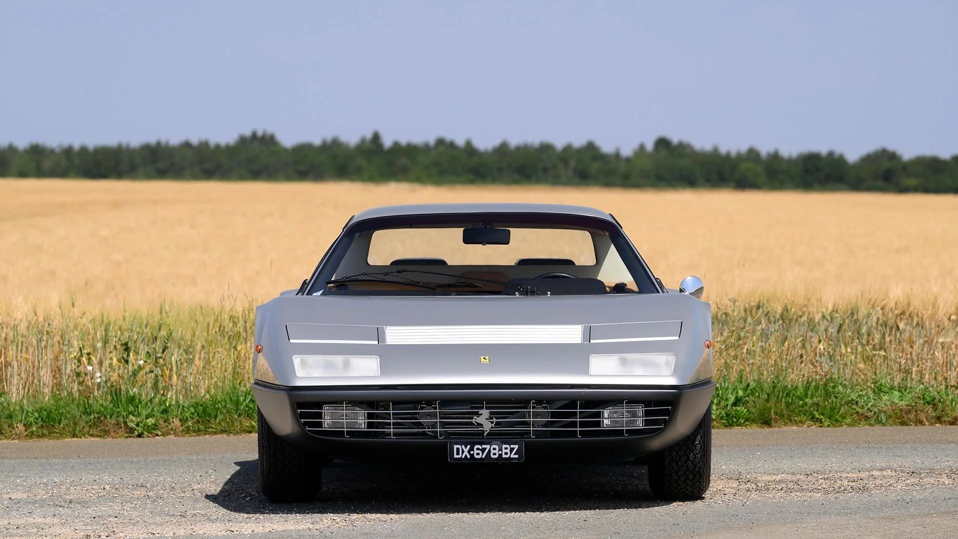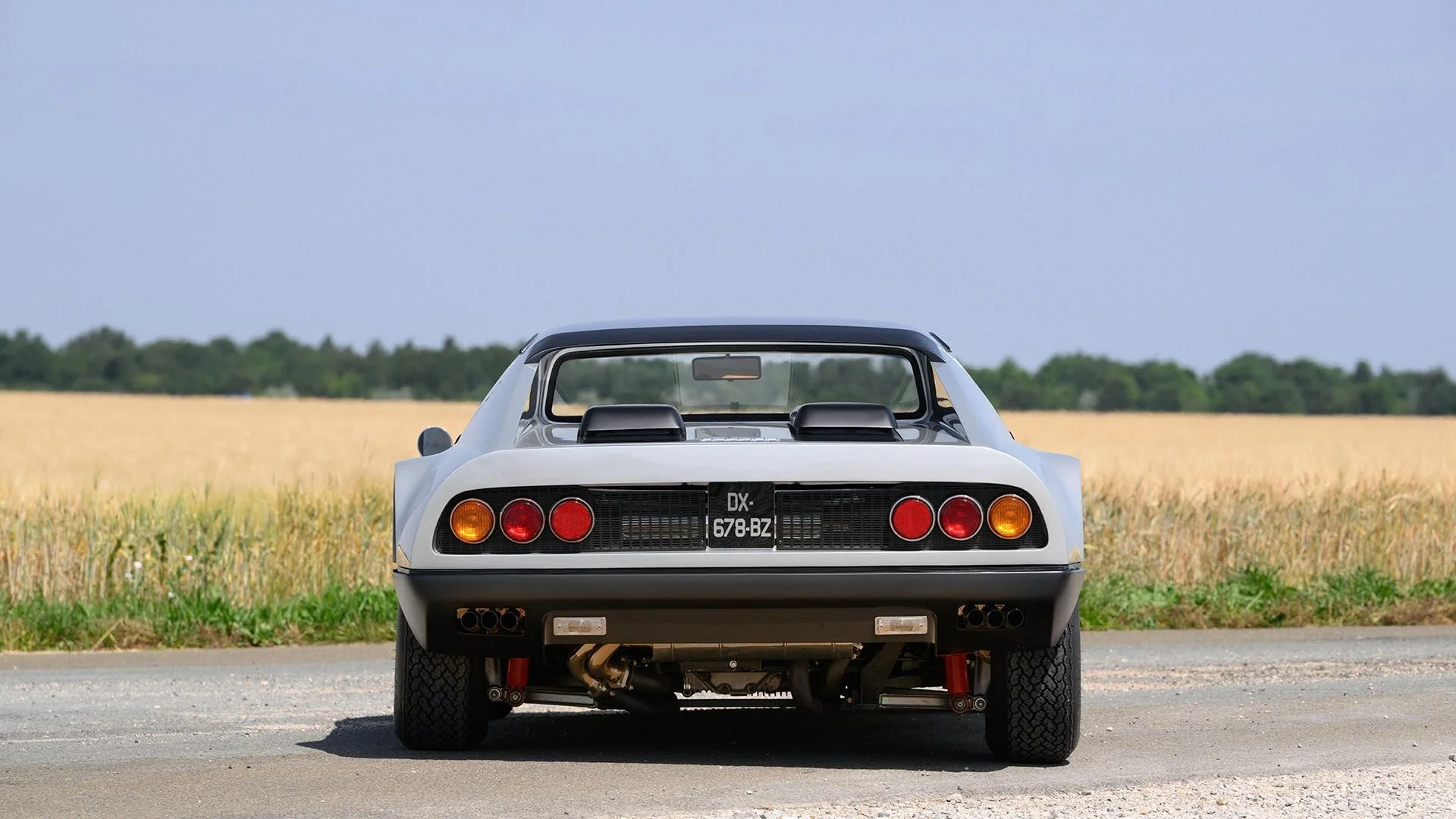 Cette Ferrari 365GTB/4 est une version de route convertie à l’époque en version Groupe 4. Livrée neuve par la Franco-Britannic Autos à Paris, elle arborait à l’époque une livrée très classique en Argento Auteuil Metallizzato et un intérieur en cuir noir.