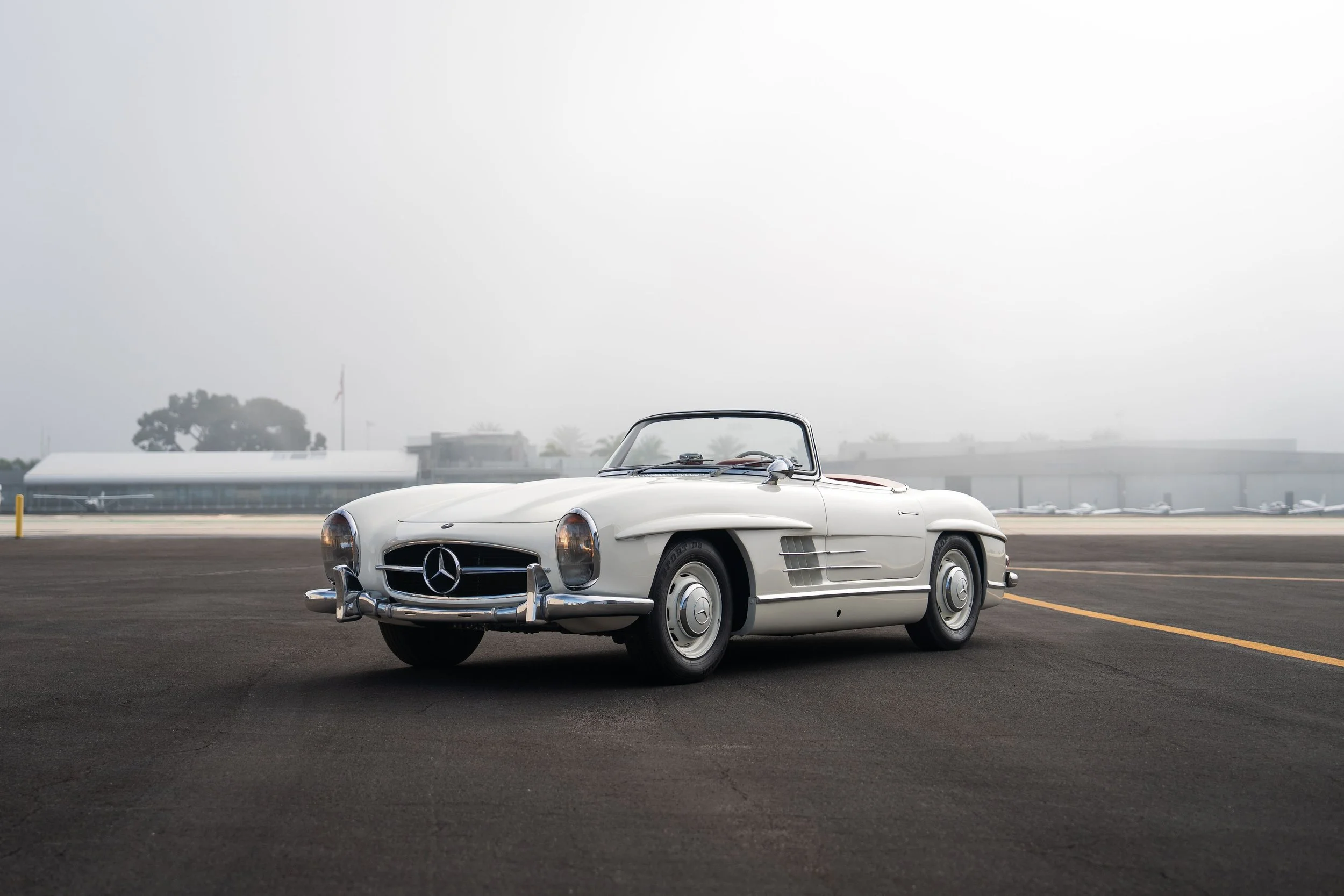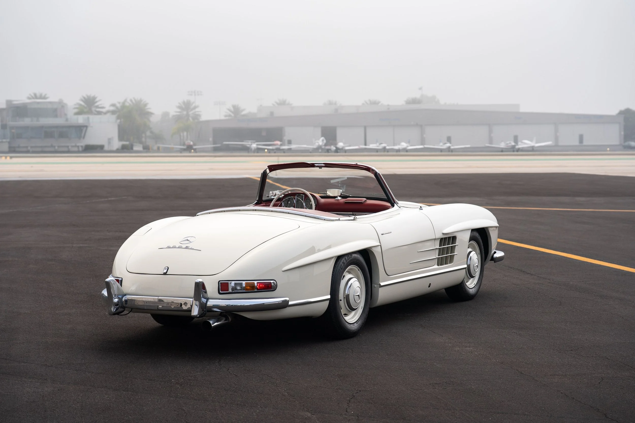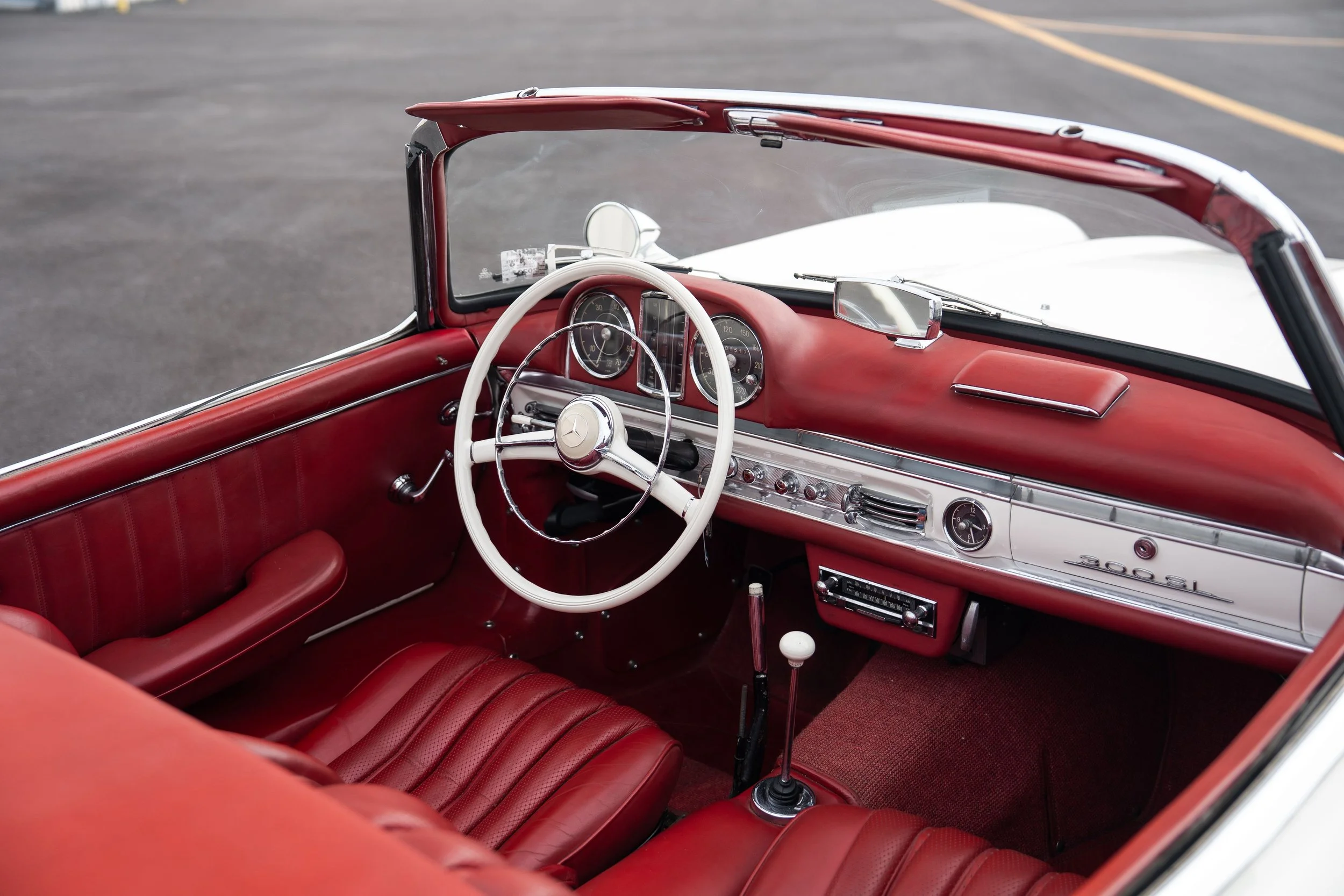 Livrée neuve le 31 Mai 1957 à Stuttgart, cette Mercedes-Benz 300SL Roadster était initialement configurée en vert (DB292 grüen mel) avec un intérieur en cuir jaune (1065 gelb). Depuis, la voiture a malheureusement perdu sa configuration très originale pour en gagner une plus consensuelle ivoire avec intérieur rouge. L’historique de la voiture reste flou même si l’on sait que la voiture a été importée au Japon avant d’être finalement importée aux Etats-Unis.