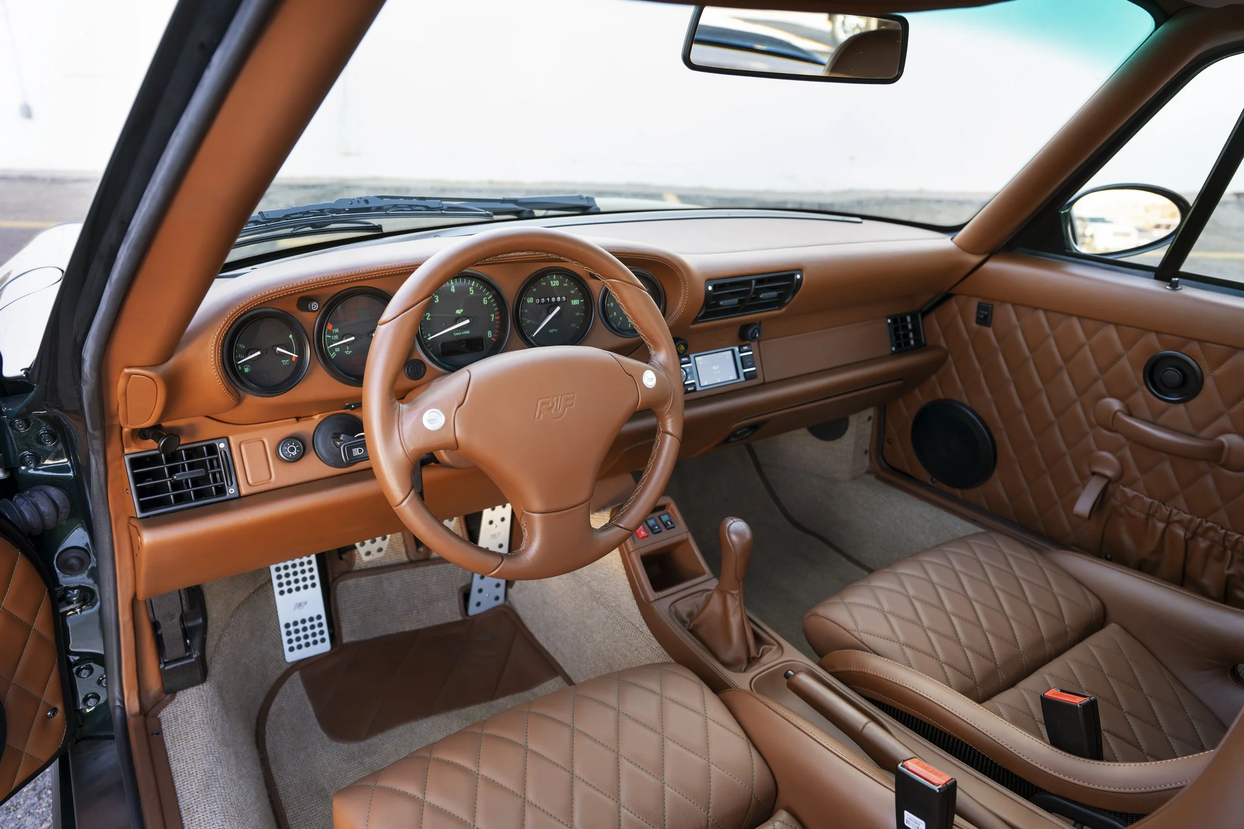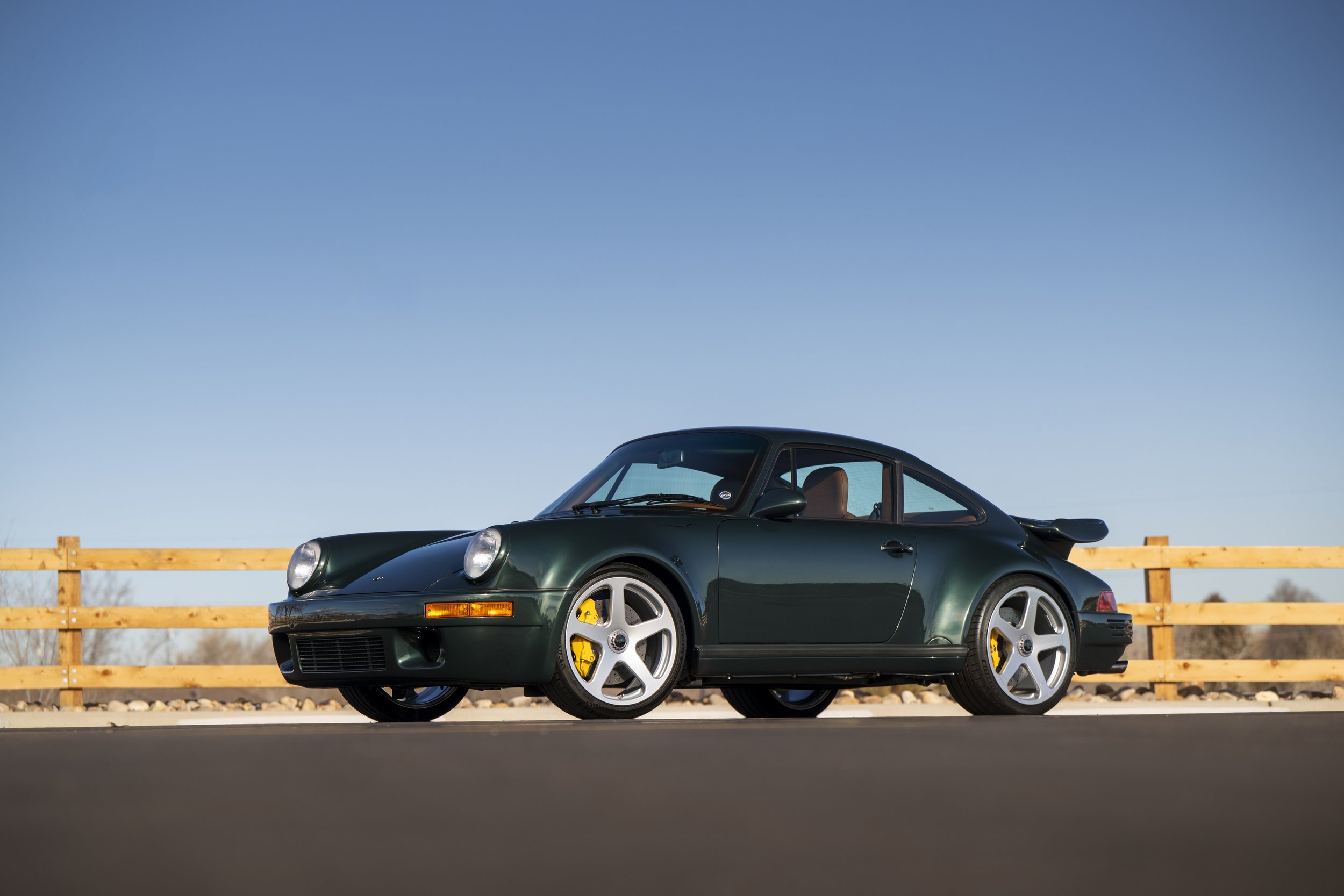 Peinte en Forest Green Metallic et personnalisée avec un intérieur beige et marron, cette RCT EVO est basée sur une 911 type 964. Animée par un moteur de 425 horsepower, le travail sur la carrosserie permet à la voiture de dépasser les 320 km/h en vitesse de pointe.