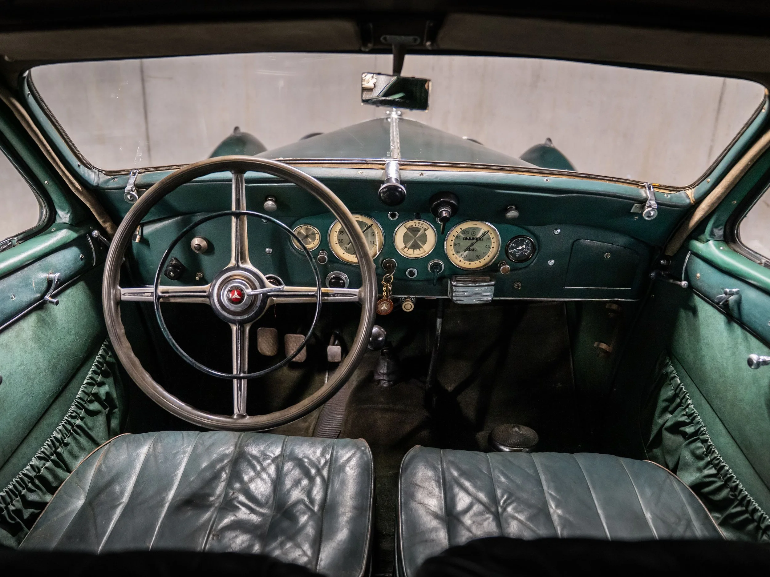 Équipée de sa motorisation SS à triple carburateurs, cette 6C 2500 “Sports Sperimentale” est l’un des cinq seuls exemplaires à empattement long produits, dont seulement deux à trois survivraient aujourd’hui. Achevée le 15 avril 1952 dans sa combinaison d’origine gris / cuir bleu, elle fut livrée neuve au Texas avant de passer entre les mains de personnalités américaines telles que l’architecte William Kesling. Restaurée avec soin dans les années 2000 par des spécialistes de la marque, elle remporta plusieurs prix dont Best Alfa Romeo et Best of Show au Detroit Concorso d’Italia. Documentée par un historique complet, un Certificato di Origine et une correspondance de Carlo Felice Bianchi Anderloni, elle figure parmi les plus rares et désirables 6C d’après‑guerre.