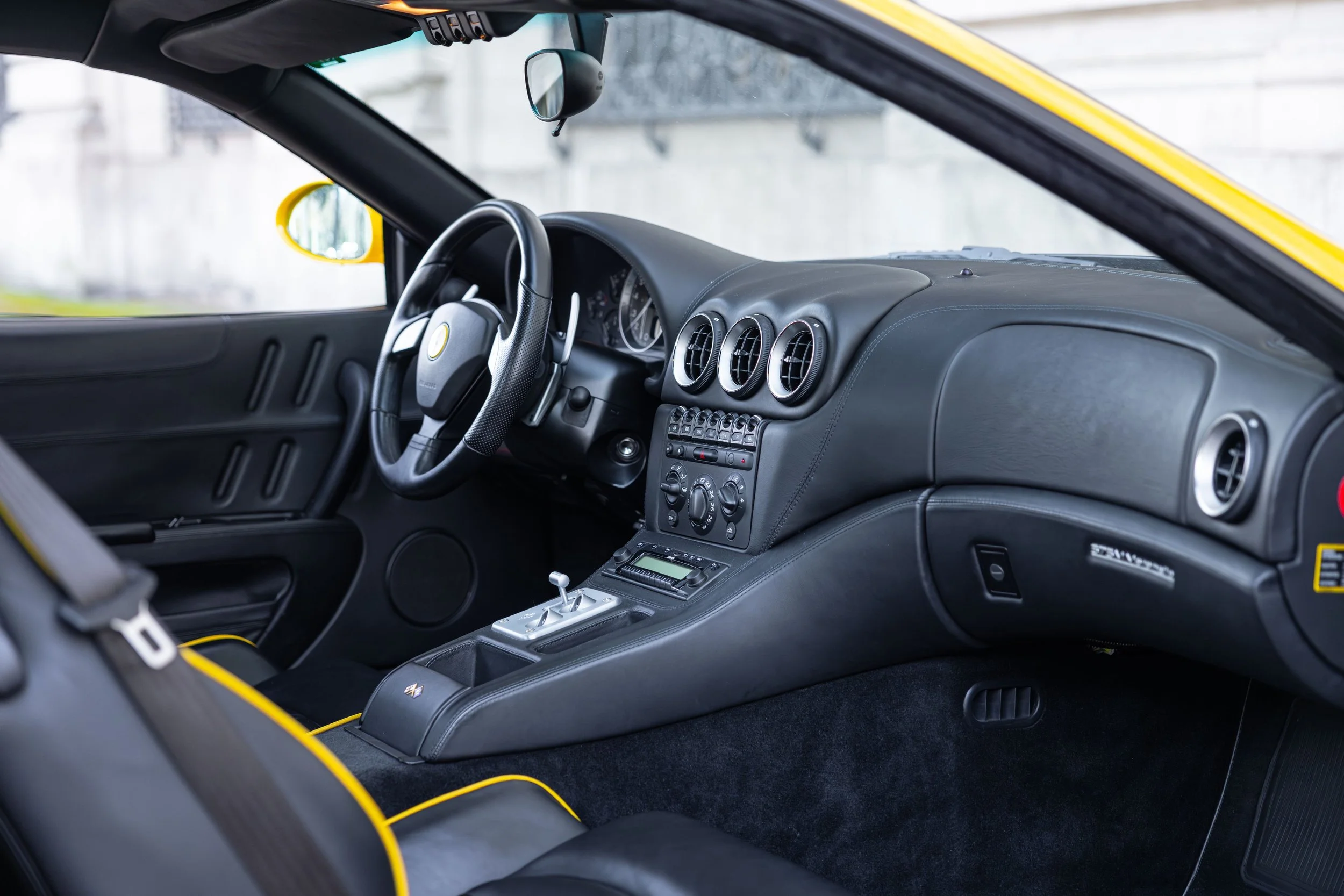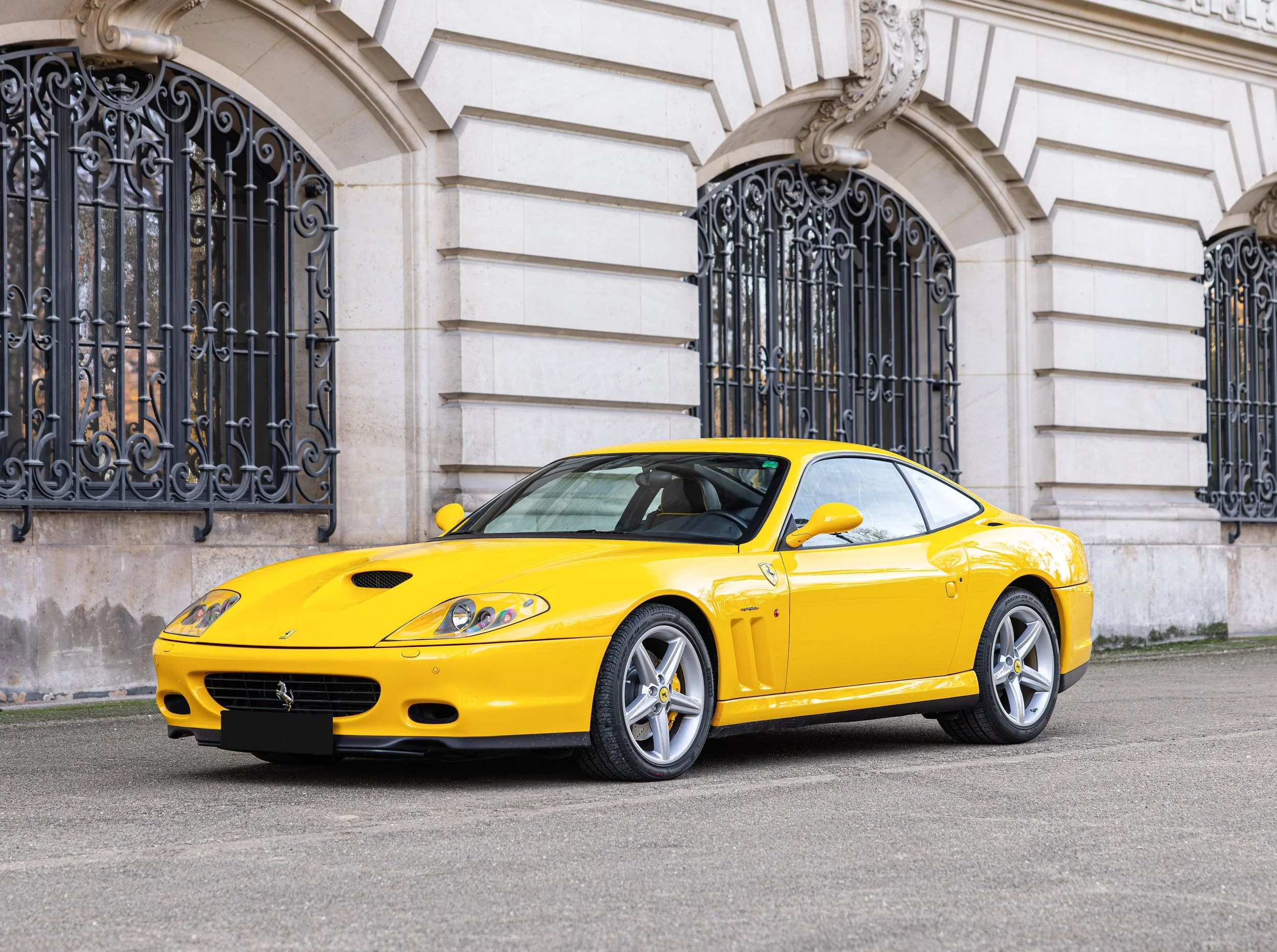 Cette Ferrari 575M Maranello de 2002 affiche 32 933 km et a été livrée neuve au Royaume‑Uni, aujourd’hui immatriculée en Roumanie. Elle est présentée en Giallo Modena avec intérieur Nero à passepoils jaunes et dispose d’un historique d’entretien complet chez Ferrari et spécialistes.