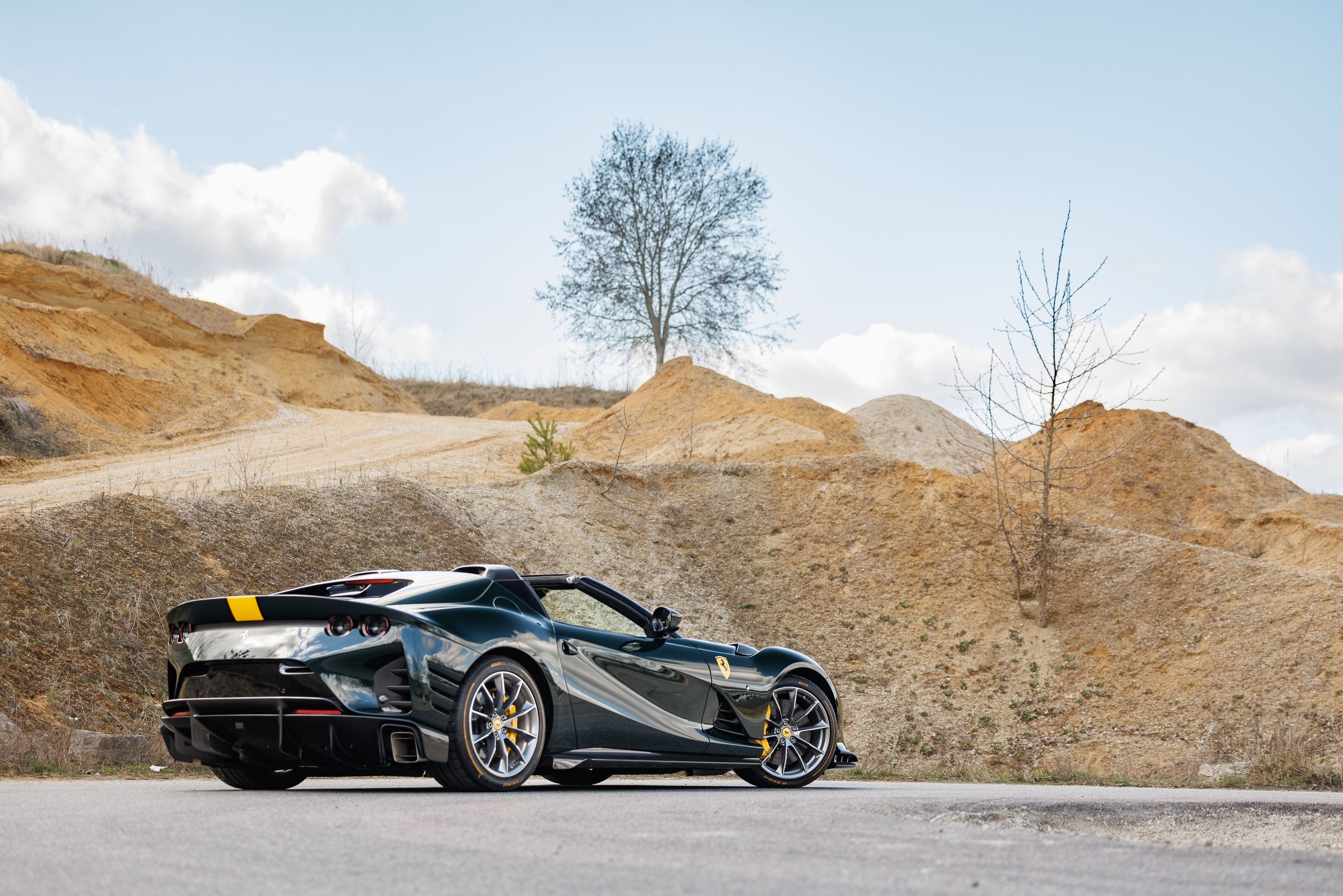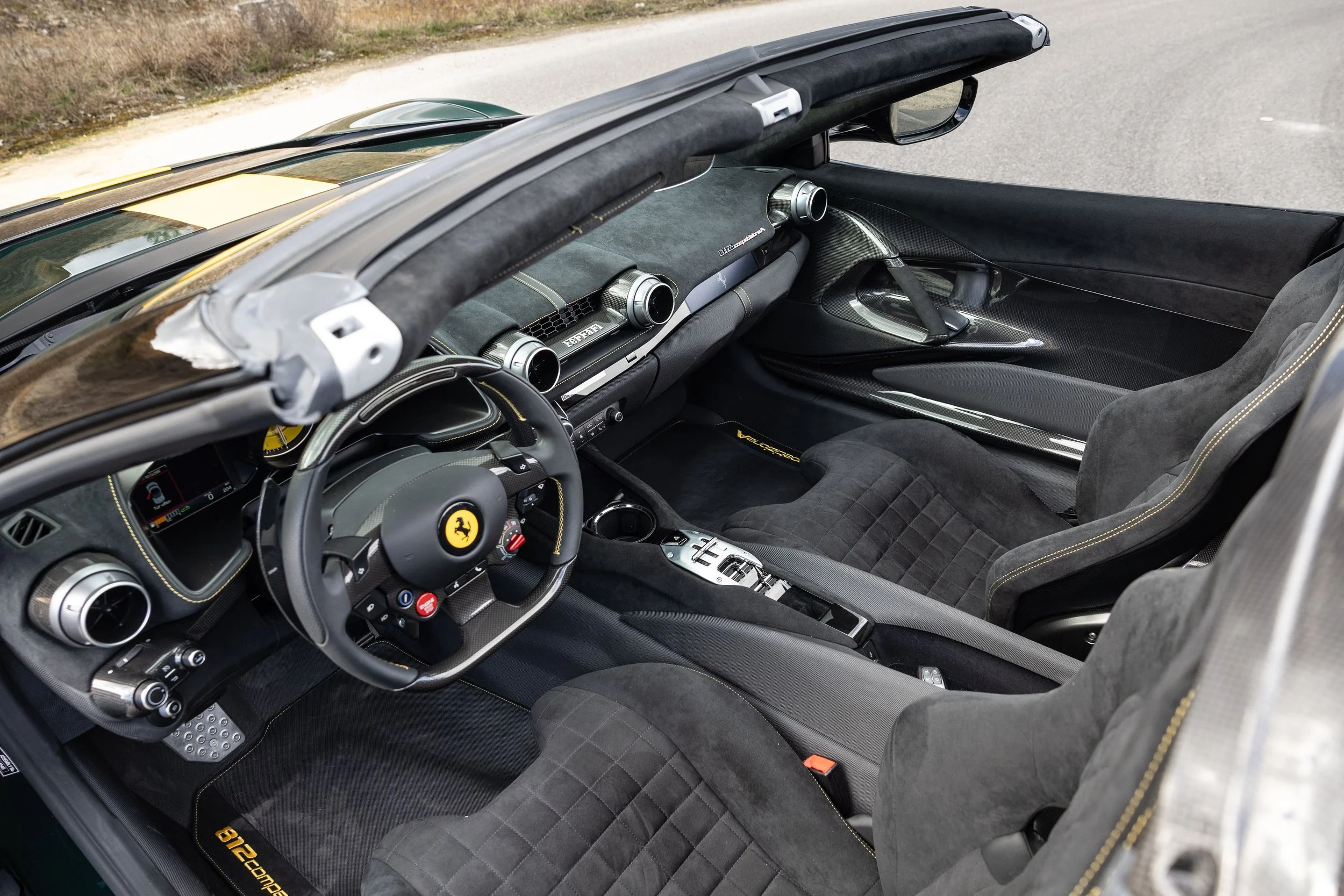 Le châssis ZFF04TMA1P0293816 présenté ici illustre parfaitement cette philosophie d’exclusivité. Livré neuf en Allemagne, il arbore une configuration particulièrement raffinée mêlant une teinte extérieure Verde British Racing à une bande centrale Giallo Fly, un choix rare et spectaculaire qui souligne son caractère unique. L’habitacle, en Alcantara noir, est rehaussé de surpiqûres jaunes et d’un Cavallino brodé dans la même teinte sur les appuie-tête. La voiture bénéficie d’un ensemble d’options d’usine très complet : éléments de carrosserie en fibre de carbone (toit rigide, diffuseur, entrées d’air, couvre-moteur, bas de caisse, poignées intérieures), jantes forgées polies diamant, sièges baquets Racing à motif quadrillé, compte-tours jaune, système hi-fi haute puissance, Apple CarPlay, phares adaptatifs, suspension lifter, écussons Scuderia peints à l’aérographe et pneus Pirelli à marquages colorés. L’ensemble est accompagné de tous les livres et outils d’origine.